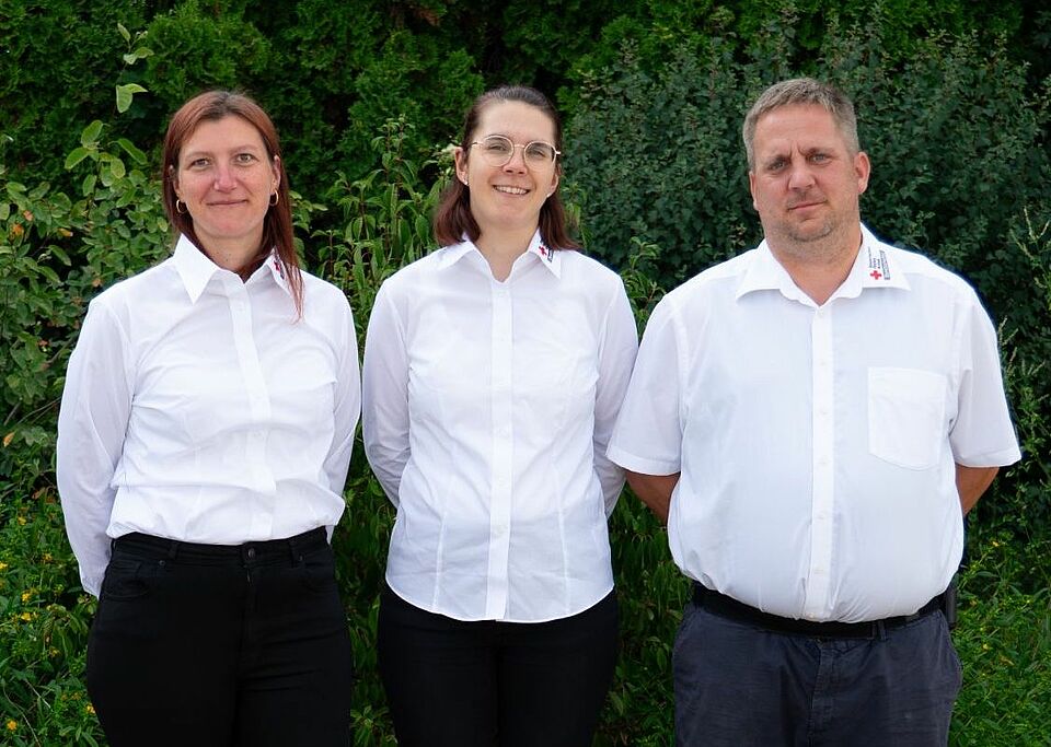 Oliver Pockberger (Bereitschaftsleiter), Anabel Kuziak (1. Stv. Bereitschaftsleiterin) und Julia Pockberger (2. Stv. Bereitschaftsleiterin und Bereitschaftsjugendwartin), (von rechts nach links). Nicht auf dem Bild ist Wolfgang Weng (Bereitschaftsarzt).