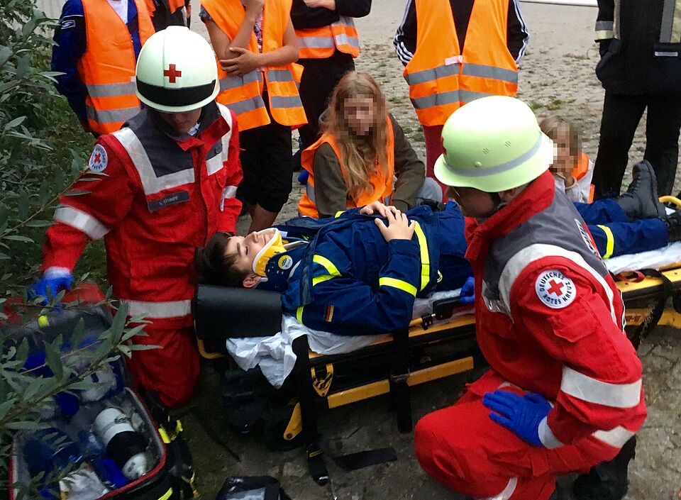 Insgesamt acht Verletzte, von denen einige durch Puppen dargestellt wurden, übergab die Feuerwehr im Laufe der Übung dem BRK. Dafür war eine Verletztensammelstelle eingerichtet worden, in der eine erste orientierende Untersuchungen erfolgte. Danach wurden die Patienten je nach Dringlichkeit einer weiteren Diagnostik zugeführt. Bei den Basis-Ersthelfer-Maßnahmen unterstützte die Jugendfeuerwehr die Kräfte des BRK.